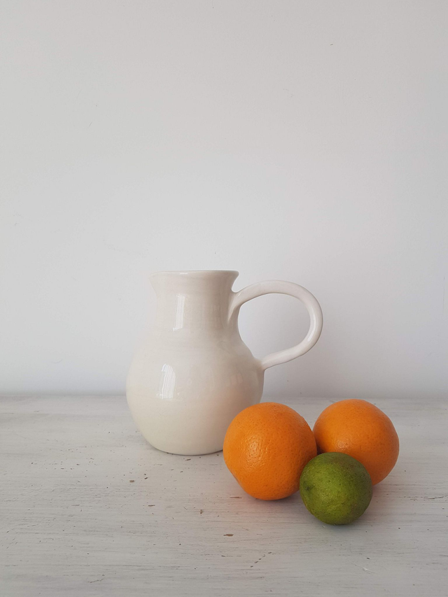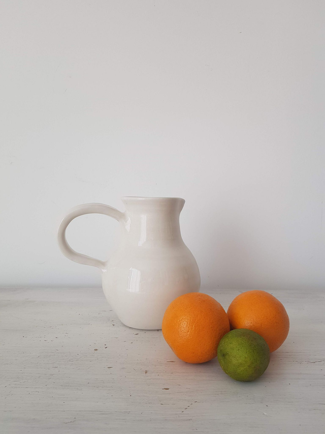 Pichet en grès blanc, émail blanc brillant, ligne élégante façonné à la main avec minutie et amour. Il convient parfaitement pour les amoureux des matières naturelles et est le cadeau idéal à offrir. Il peut être utilisé en carafe pour contenir un liquide ou comme vase.