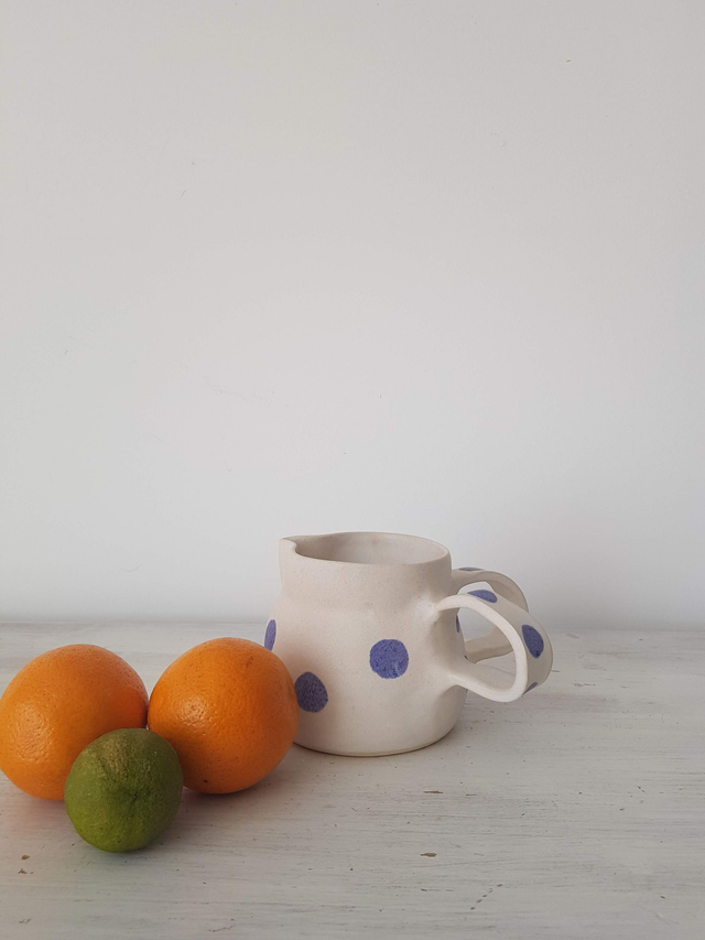 Pichet en grès blanc (taille M), émail de couleur blanc mat, avec de l'engobe bleu, façonné à la main avec minutie et amour. Il convient parfaitement pour les amoureux des matières naturelles et est le cadeau idéal à offrir. Il peut être utilisé en carafe pour contenir un liquide ou comme vase.
