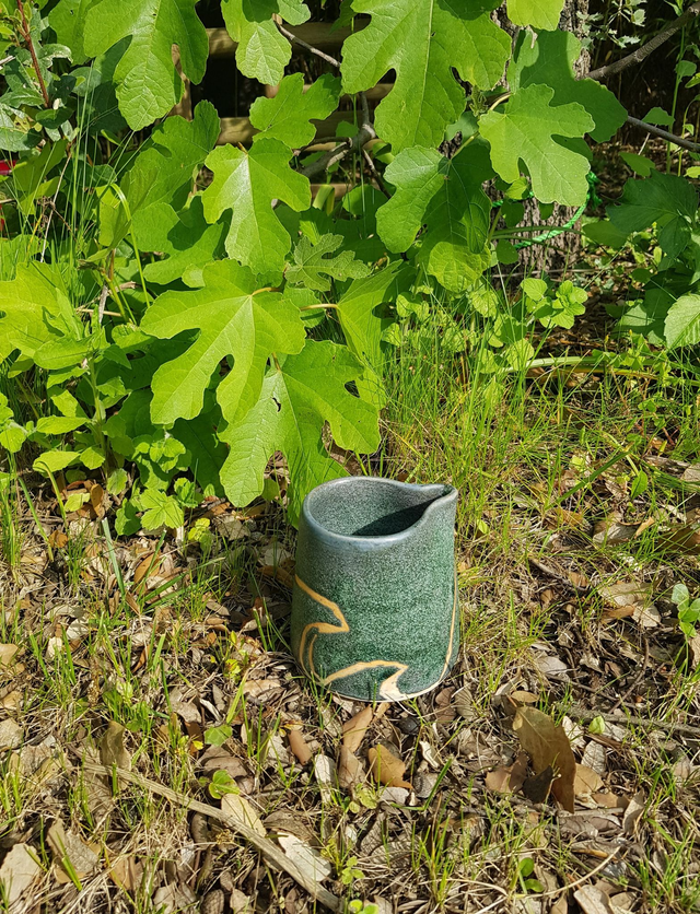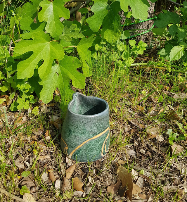 Pichet en grès blanc, émail de couleur bleu avec des nuances de vert, façonné à la main avec minutie et amour. Il convient parfaitement pour les amoureux des matières naturelles et est le cadeau idéal à offrir. Il peut être utilisé en carafe pour contenir un liquide ou comme vase.