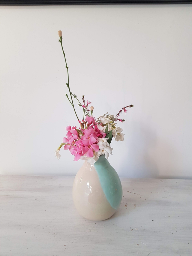 Vase en grès blanc, émaux transparent et bleu, façonné à la main avec minutie et amour. Il convient parfaitement pour les amoureux des matières naturelles et est le cadeau idéal à offrir. Il peut être utilisé en carafe pour contenir un liquide ou comme vase.