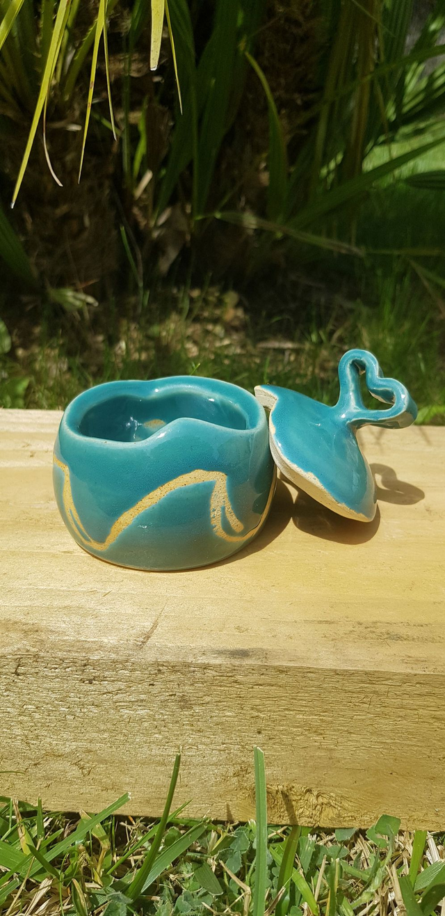 Boîte cœur en grès blanc, émail de couleur bleu turquoise, façonnée à la main avec minutie et amour. Elle convient parfaitement pour les amoureux des matières naturelles et est le cadeau idéal à offrir. Elle peut être utilisée comme boîte à bijoux.